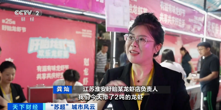 球迷:现在“苏超”盈易点,所有形象都是讲的淮安小龙虾,我们也来感受一下万人龙虾宴的盛况。