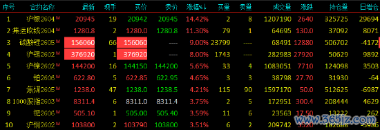 2026年1月12日,国内期货主力合约涨跌互现。沪银涨超14%,集运欧线涨超11%,碳酸锂、沪锡均封涨停板,沪镍涨超5%,铂、焦煤涨超4%;跌幅方面,多晶硅跌超2%,花生、燃料油跌超1%。